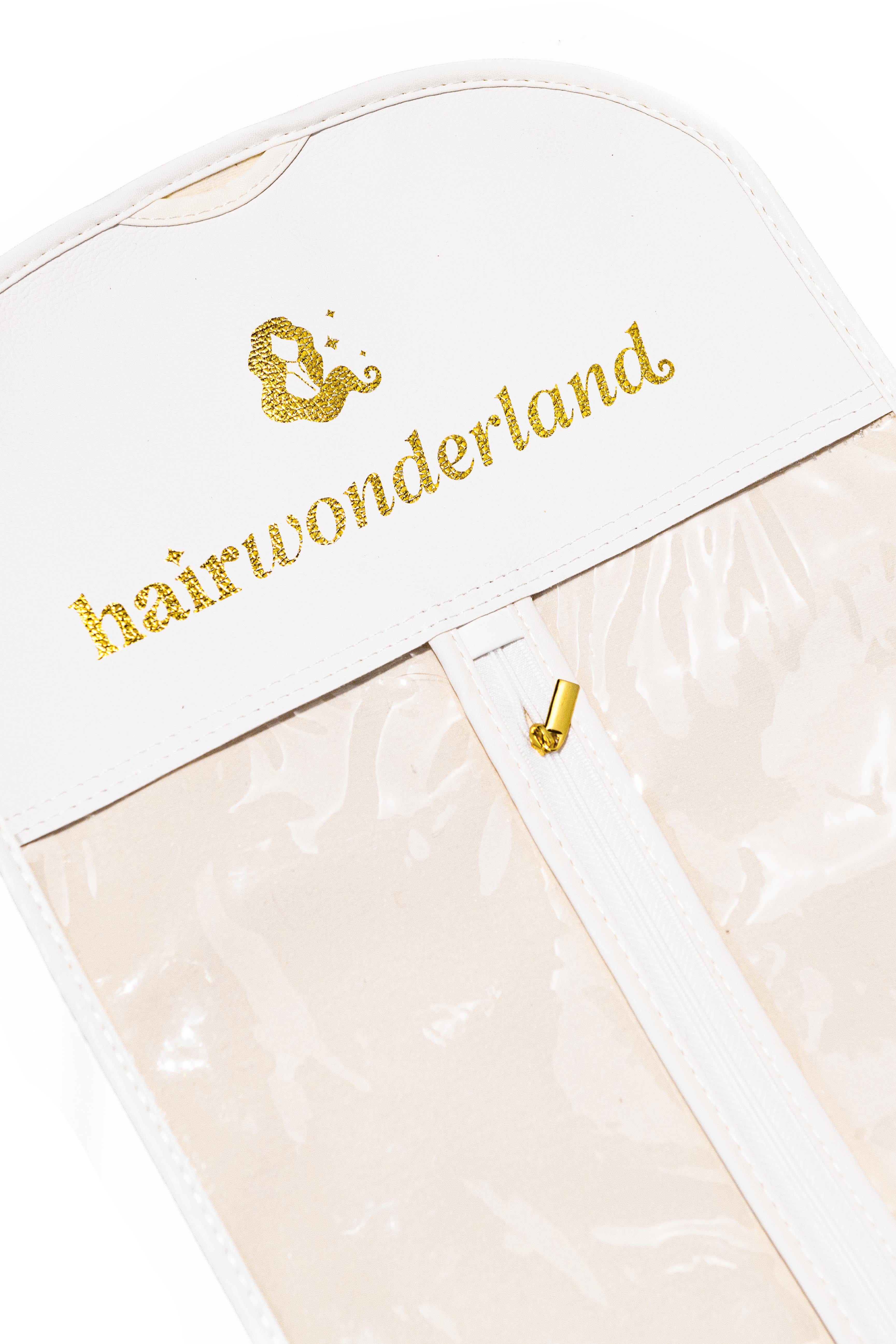 Storage bag for clip in extensions and hair pieces. Comes with a coat hanger style hanger for you to hang your hair pieces on to store inside bag.